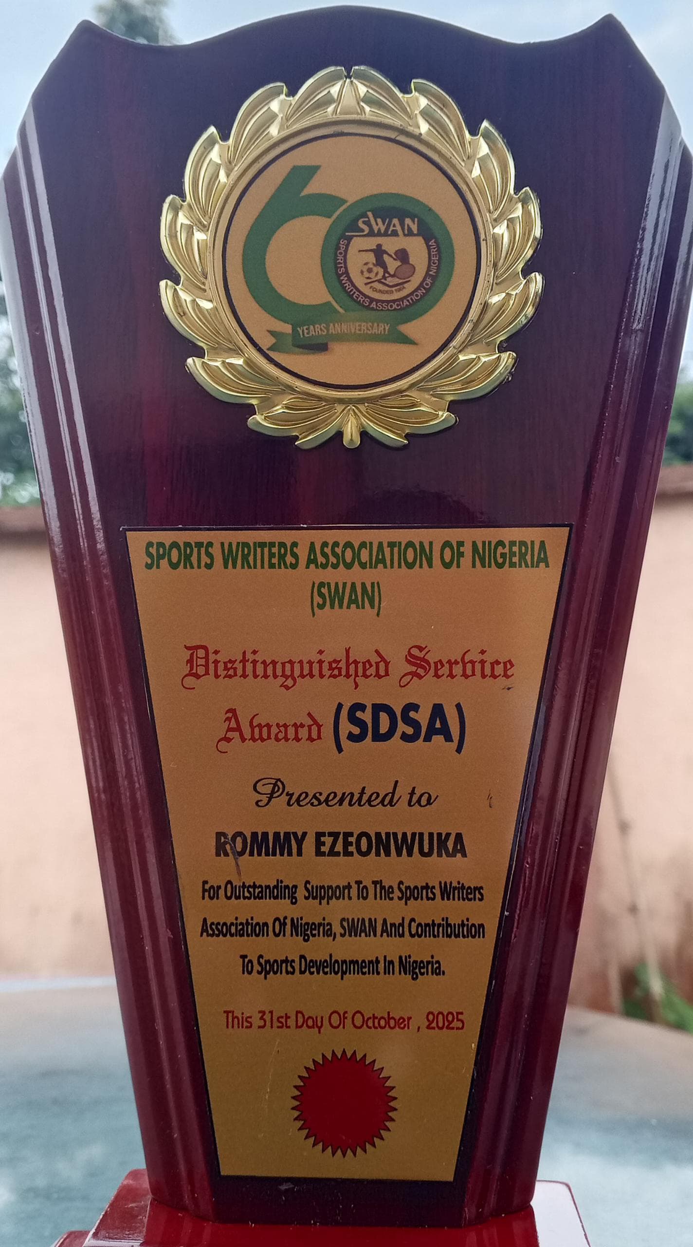 Ezeonwuka was bestowed the Sports Writers Association of Nigeria (SWAN) Distinguished Service Award (SDSA) by the national leadership of the body for his contributions to sports development in Nigeria during the just concluded diamond jubilee of the association in Abuja.